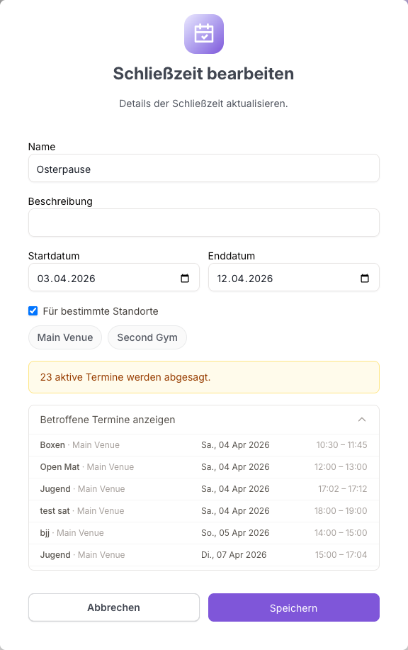 Während du die Daten eingibst, zeigt Omoplata eine Echtzeit-Vorschau, wie viele Kurstermine abgesagt werden, und listet jeden betroffenen Kurs mit Datum und Uhrzeit auf. Prüfe diese Liste vor dem Speichern, um sicherzustellen, dass die Schließzeit den richtigen Zeitraum abdeckt.